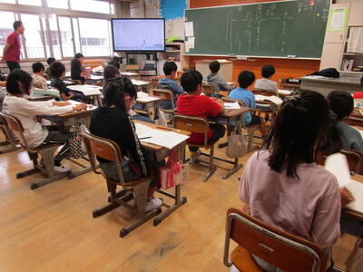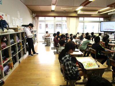 3時間目に4年生の教室を見てみると、算数の授業を行っていました。先週から来ている教育実習生も授業実習を行っていました。自宅のお風呂に水がたまる様子などを撮影し、自作の動画を編集し授業の導入で子どもたちに見せるなどの工夫をして、子どもたちの興味・関心を高めていました。