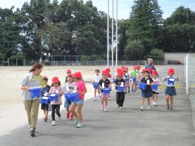 【1年生】1枚目の写真は、生活科の学習の様子です。「水遊び」をしています。マヨネーズなどの入れ物を水鉄砲にしてして、発射させています。みんな大はしゃぎです。