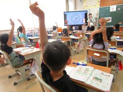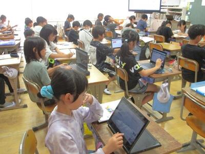 【1年生】1枚目の写真は、算数の時間の様子です。タブレットを使って習熟の問題に挑戦している様子です。子どもたちは、あっという間に使い方を覚えてしまいます。