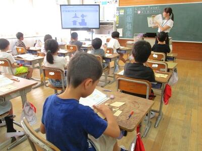 【2年生】1枚目の写真は、算数の「さんかくや しかくの 形を しらべよう」の学習の様子です。三角形や四角形の形を使って、いろいろな形づくりに挑戦しました。