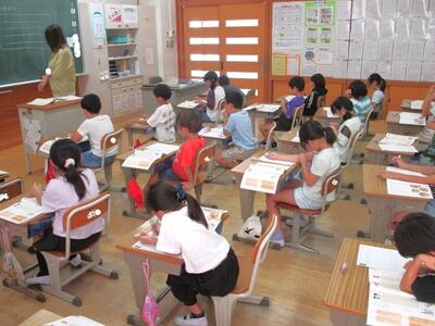 【2年生】少しずつ運動会が近づいてきていますね。2年生の教室でラジオ体操の音楽が聞こえてきました。今年は、お兄さんお姉さんとして、1年生のよいお手本になります。