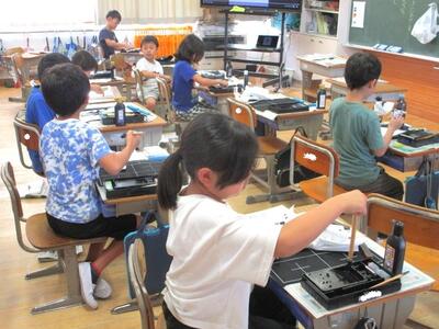 【3年生】1枚目の写真は、国語の書写の時間の様子です。3年生から始まった毛筆での習字も、学習後の習字道具の片付けもすっかり上手になりました。