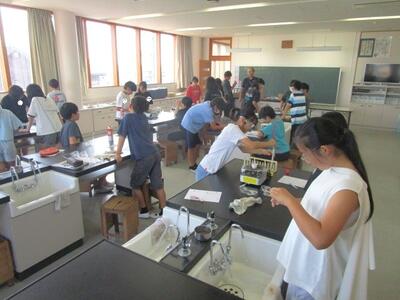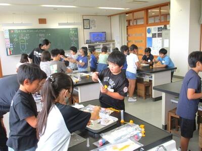 【4年生】1枚目の写真は、理科の「とじこめた空気や水」の学習の様子です。閉じ込めた空気を押すと、中に入れた発泡スチロールの人形が小さくなることに驚いていました。