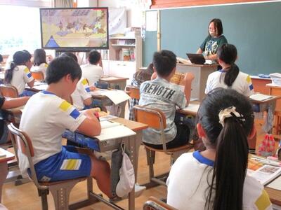【3年生】1枚目の写真は、理科の「こん虫のかんさつ」の学習の様子です。1枚目の写真で先生が持っているのはアリの模型です。頭や胴体など、大きさの違いに子どもたちは驚いていました。