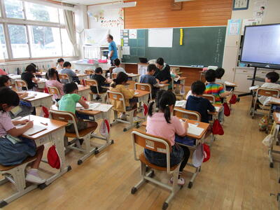 1年生の教室をのぞいてみると、どの教室も整然と授業が進行していました。
