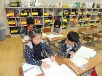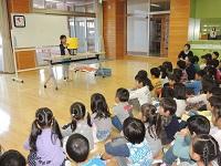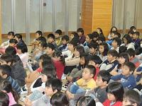 初めに、校内読書週間が行われていますので、読書感想文コンクール入賞者の作文発表を行いました。とても上手でした。次に、「自分で考えることの大切さ、そして、考えるために読書をすることの大切さ」について話しました。「おはなし」の小道具やエプロンシアターを使って話をしました。最後に、今月の「阿小っ子のめあて」について、係の先生から分かりやすく話がありました。先生が大学時代に使っていたノートも登場しました。
