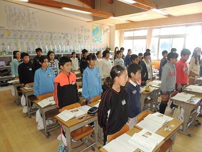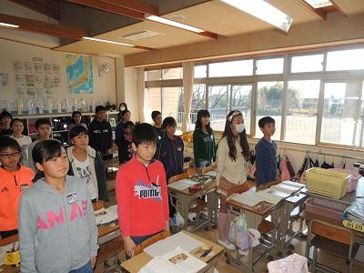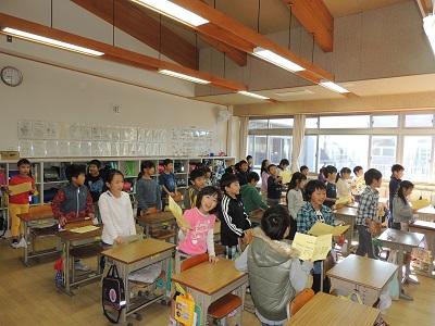 朝の歌(高根沢町の歌)が終わって、子どもたちの健康観察です。「はい!元気です。」「名札OK!」