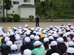 全員がそろってから、校庭で齋藤所長さんと亀井さんから、「いかのおすし」など不審者に遭遇したときにとるべき行動についてお話いただきました。