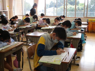 そんな、よい姿勢を意識しながら6年生の教室を見てみると、さすがは6年生です。どの子もしっかりとした姿勢で授業に取り組んでいました。特に書写の学習をおこなっていたので、よい姿勢を保つと美しい字を書くことができますね。すばらしい字を書いている児童がたくさんいました。