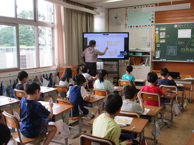 三角形と四角形について学習していました。いろいろな形をグループに分ける作業のあと、「へん」や「ちょう点」などの用語を勉強していました。
