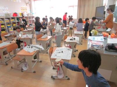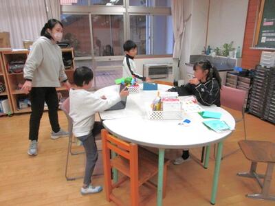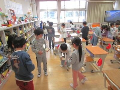 【1年生】1枚目と2枚目の写真は、生活科の学習の様子です。昨日つくり始めた松ぼっくりのけん玉が完成しました。子どもたちは、さっそく遊ぶのに夢中になっていました。