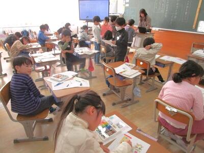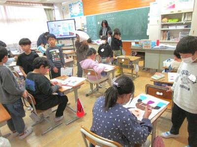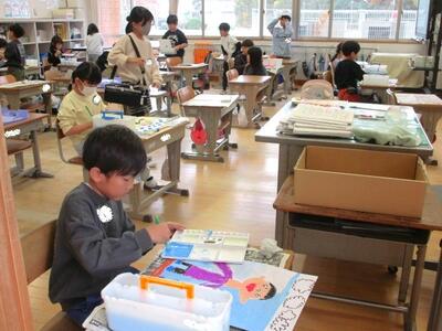 【2年生】1枚目と2枚目の写真は、図画工作の時間の様子です。今は、サツマイモほりの様子を絵に表しています。サツマイモが出てきた時の喜びがいっぱいです。