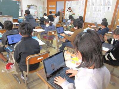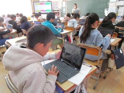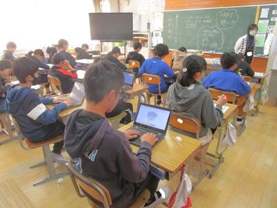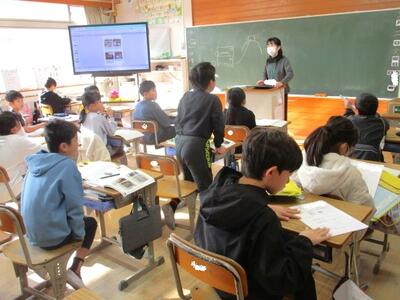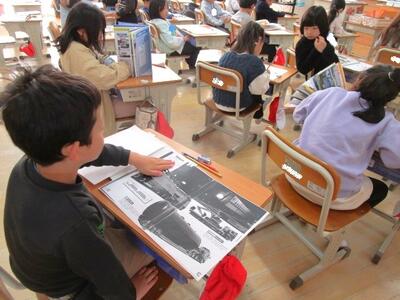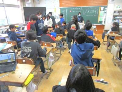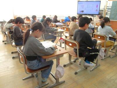 【5年生】1枚目の写真は、6年生の総合的な学習の時間に作成した古都鎌倉の様子を5年生に伝える活動をしている様子です。来年の修学旅行に役立てようと、5年生も真剣に聞いています。