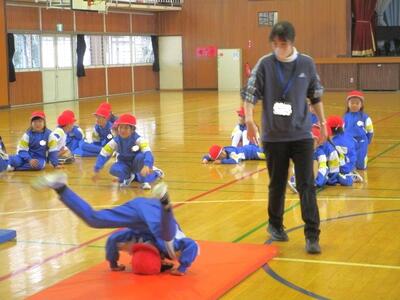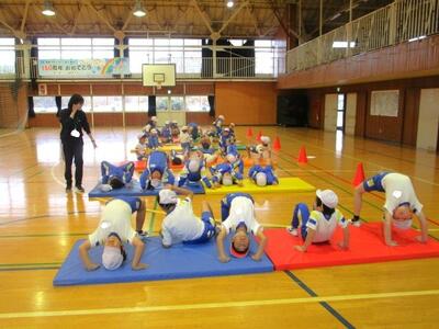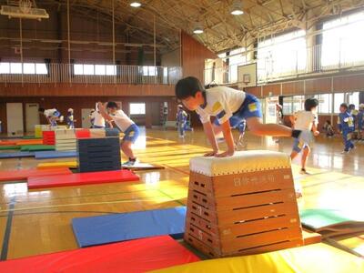【1年生】1枚目の写真は、体育の「マット遊び」の学習の様子です。マットを使った運動遊びが始まりました。写真は、後まわりに挑戦している様子です。