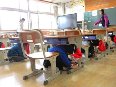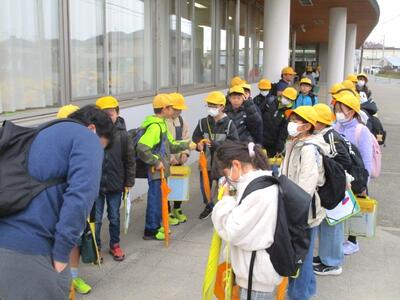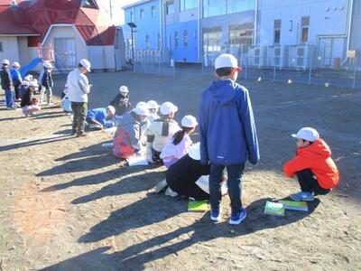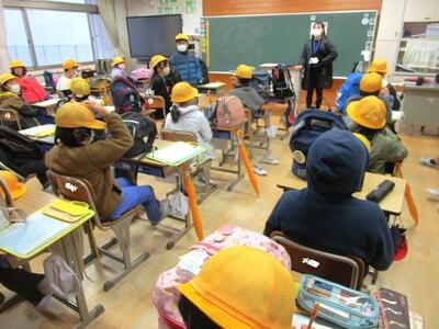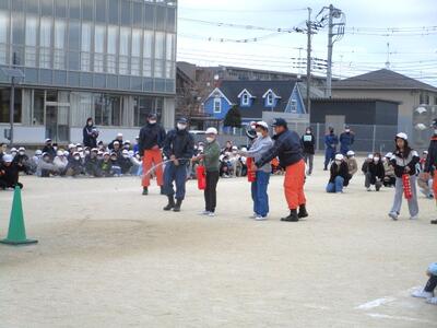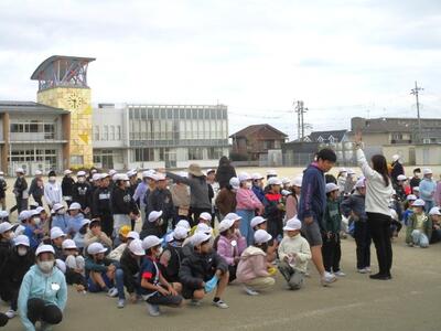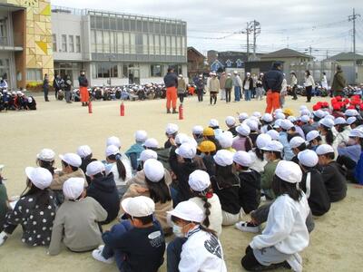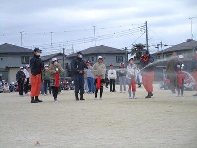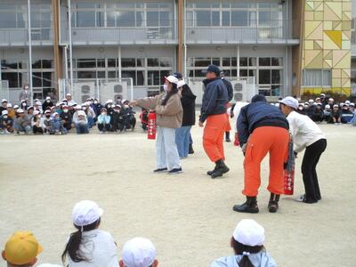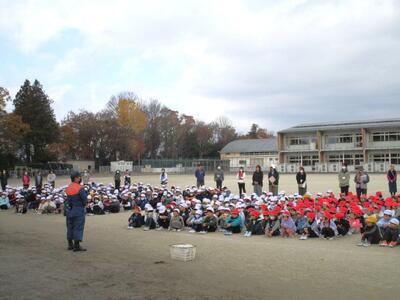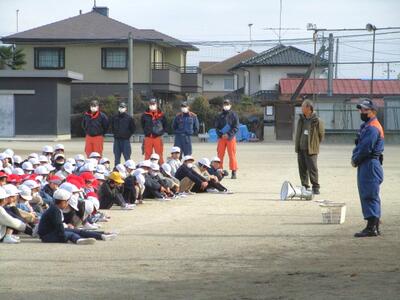 本日の2校時に、避難訓練を実施しました。地震がきた後に、理科室から出火したという想定で、各教室から校庭の南に避難しました。学校長と消防士の方の話の後、消火器の使い方について話を聞き、5・6年生の代表者が実際に消火器から水を放水させました。子どもたちには、自分を守る力を身に着けてほしいという話をしました。