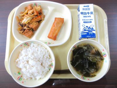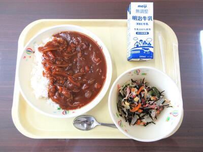 今日の献立は「ご飯、牛乳、ハッシュドポーク、カニカマ入り海藻サラダ」です。おいしくいただきました。