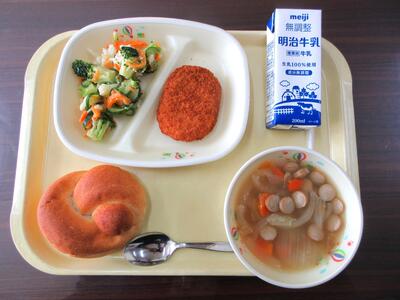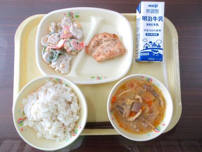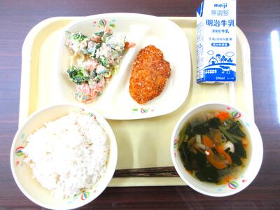 今日の献立は「麦ご飯、牛乳、チキンカツ、野菜ツナマヨ和え、生姜仕立てスープ」です。おいしくいただきました。