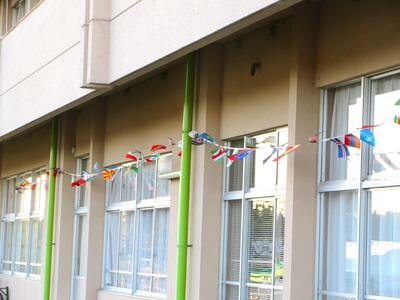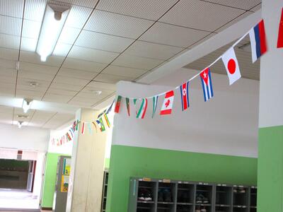 また、学校全体で運動会の気分をさらに盛り上げようと、児童昇降口に万国旗(簡易版)を設置しました。