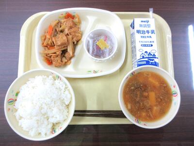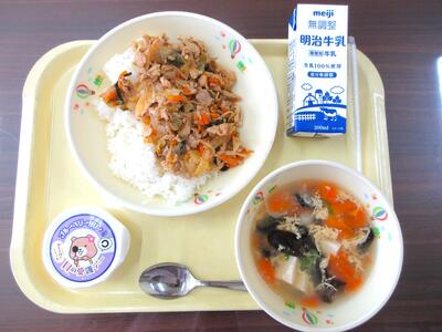 今日の献立は「プルコギ風ぶた丼、牛乳、きくらげとたまごのスープ、ブルーベリーゼリー」です。おいしくいただきました。