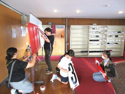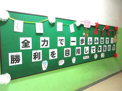 子どもたちは、全力で運動会の練習に取り組んでいます。6年生が全員で作ってくれた掲示用の運動会のスローガンを、校舎の目立つところに設置しました。