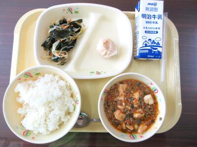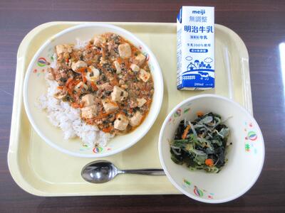 今日の献立は「マーボー丼、牛乳、チョレギサラダ」です。おいしくいただきました。