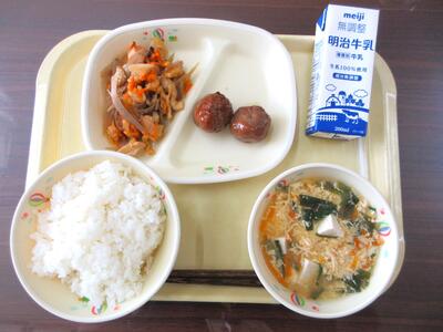 今日の献立は「セルフ五目ごはん、牛乳、肉だんご、ニラたま汁」です。おいしくいただきました。