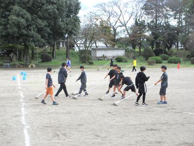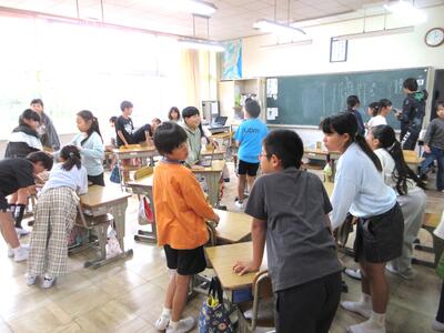 4年生の総合的な学習の時間では、他校の友達との交流会に向けて、どんな遊びがいいか試しています。
