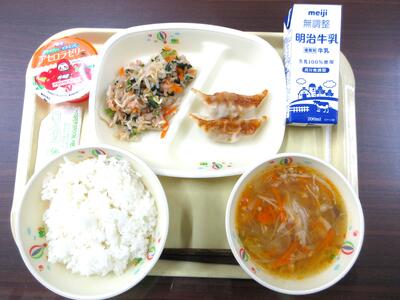 今日の献立は「ご飯、牛乳、焼き餃子、切り干し大根とツナの和え物、坦々春雨ごまスープ、アセロラゼリー」です。おいしくいただきました。