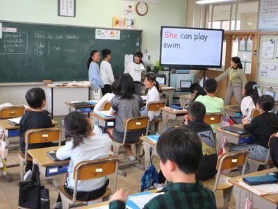 5年生の外国語では、ものがどこにあるか、英語でたずねたり答えたりしています。