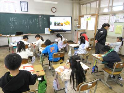3年生の外国語活動では、くだものやスポーツ、色の名前を英語で何というのか学んでいます。