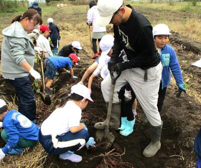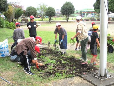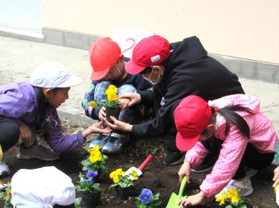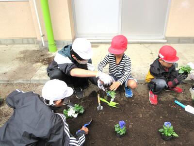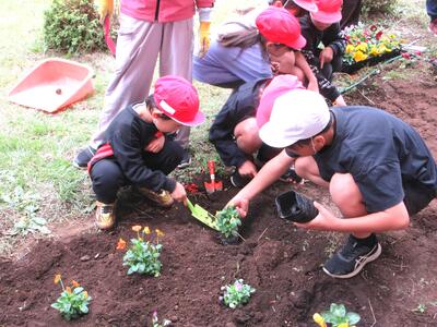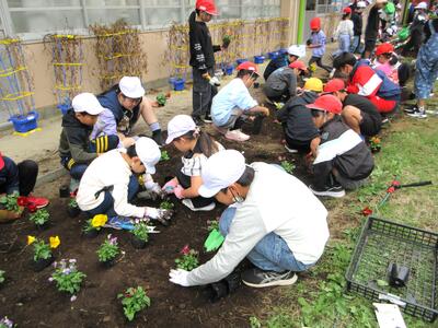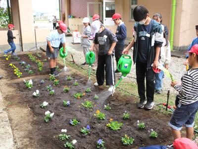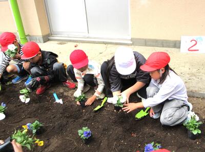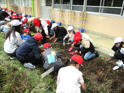 高学年の児童が、低学年の児童に植え方を教えてあげながら、みんなで協力して素敵な花壇づくりができました。