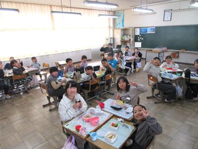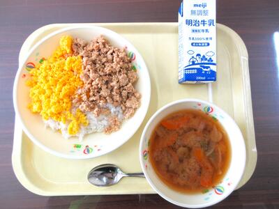 今日の献立は「二色丼(麦ご飯、大豆入りとりそぼろ、たまごそぼろ)、牛乳、根菜汁」です。今日は、「かみかみメニュー」の日なので、よく噛んで、味わっていただきました。