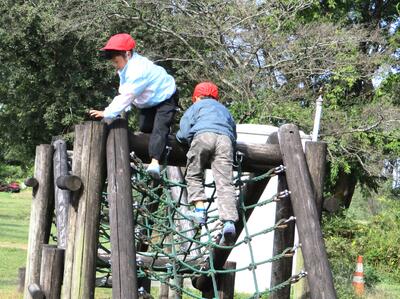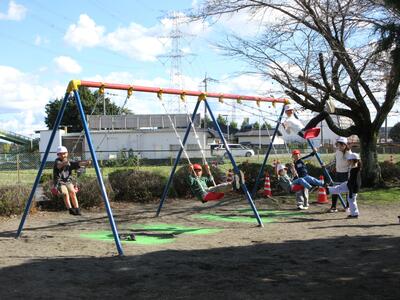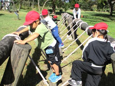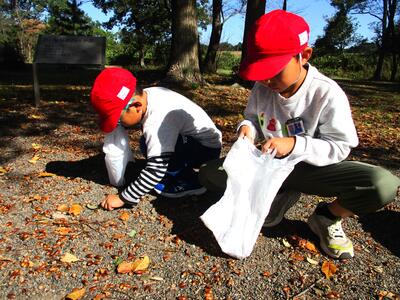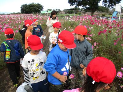 はじめに、たくさん咲き誇るコスモスを見学し、その後ドングリや松ぼっくり、落ち葉を拾ったりアスレチックで遊んだりしました。