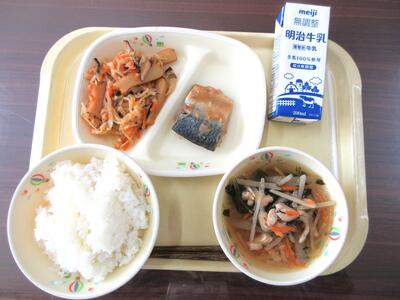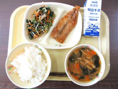 今日の献立は「ご飯、牛乳、さんまの蒲焼き、ゆずかつお和え、小松菜と油揚げのみそ汁」です。おいしくいただきました。