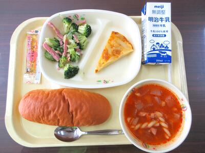 今日の献立は「牛乳パン、アップルハニー、牛乳、アンサンブルエッグ、イタリアンサラダ、ミネストローネ」です。おいしくいただきました。