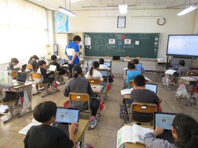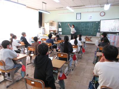 5年生は、2クラスに分かれて少人数指導を行っており、そのうちの1クラスを担当しました。児童の実態を考え、いくつかのヒントカードを準備して丁寧に授業を進めていました。