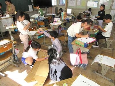 2年生の図工では、自分で作った箱の「おうち」をクラスの友達と楽しんでいます。
