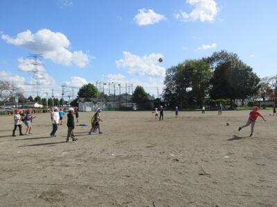 3年生の体育は、ベースボール型ゲームです。チームで対戦しています。