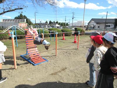 1年生の体育は鉄棒運動です。いろいろな技に挑戦しています。