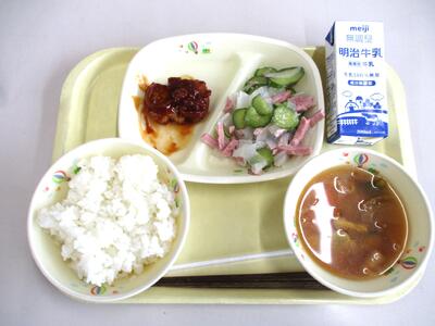 今日の献立は「ご飯、牛乳、ハンバーグケチャップソース、切り干し大根とツナの和え物、ニラ玉汁」です。おいしくいただきました。