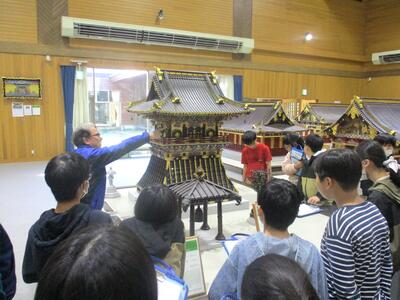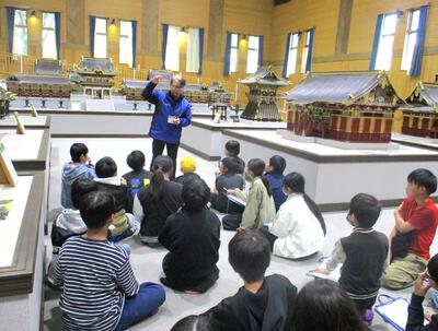 地域(原・石末宿・天神坂)の宿神会の皆様を講師にお招きして、地域に伝わるお囃子について教えていただきました。太鼓や笛、鐘の演奏を聴かせていただいた後、子どもたちは、一人一人3種類の太鼓を叩きました。