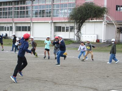 4年生の体育では、タグラクビーの練習に取り組んでいます。