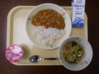 今日の給食は、むぎごはん、牛乳、カレー、アスパラガスサラダ、ヨーグルトです。本日の給食で高根沢町で生産されたものは、にんじん、アスパラガス、こめです。今日もたいへんおいしく頂きました。