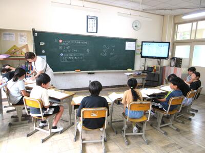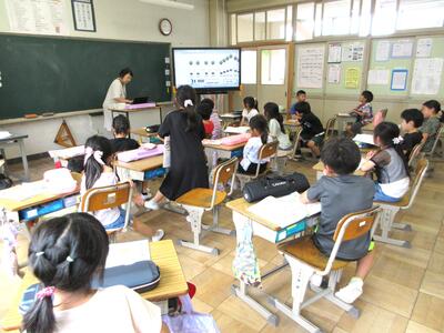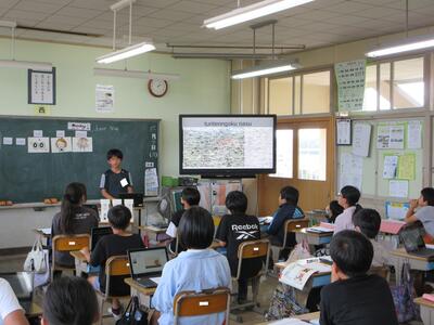 6年生の外国語では、日本の文化を写真や英語でまとめ、タブレットを使って発表しています。「ALTの先生に伝えよう」というめあてで取り組んでいました。