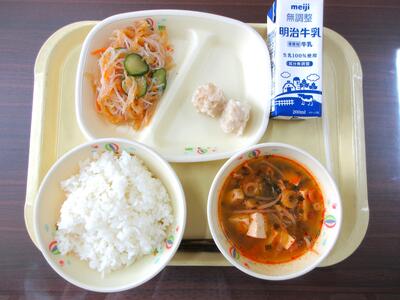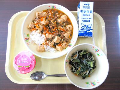 今日の献立は「マーボー丼、牛乳、チョレギサラダ、桃ゼリー」です。おいしくいただきました。