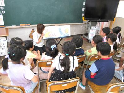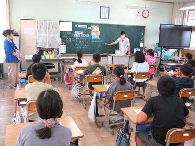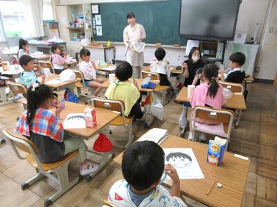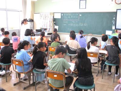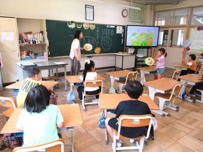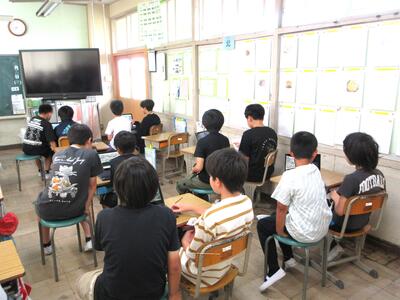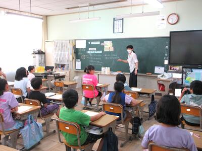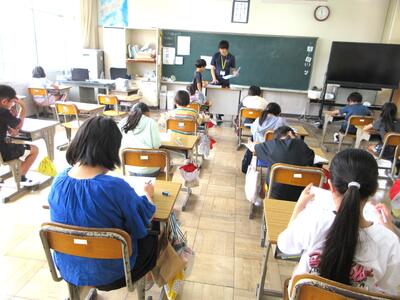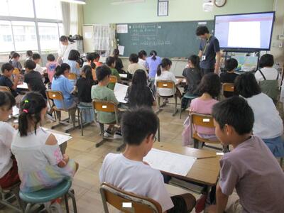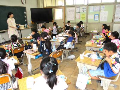 5年生の学級活動は、町の栄養士さんによる食指導です。「食生活を考えよう」というめあてで、生活習慣病の予防のために大切な食事の摂り方について教えていただきました。夏休みが近いので、子どもたちは、おやつや飲料水の摂取についても、自分で考えて生活することを理解しました。