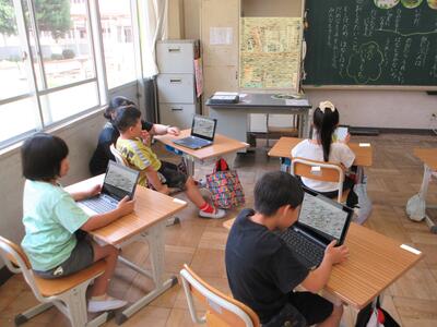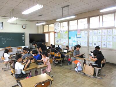 4年生の国語では、グループで作る新聞の記事をタブレットを使って書いています。