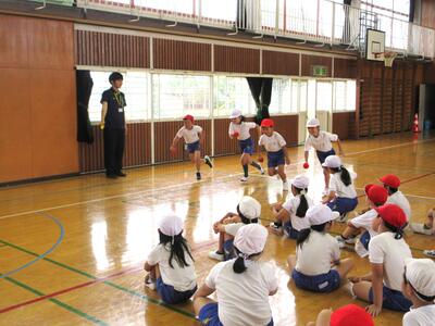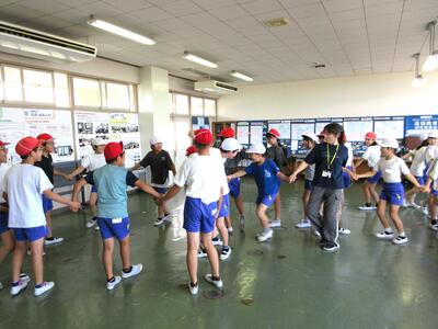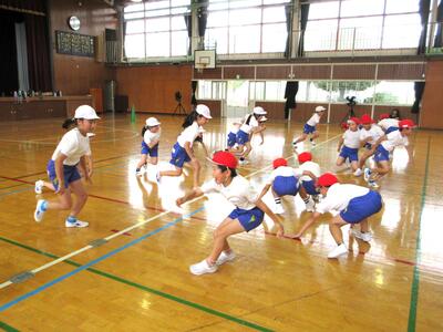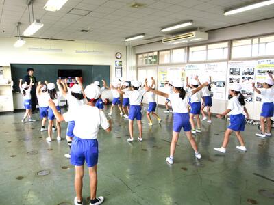 5年生の体育では、室内でウオーミングアップ中です。この後、ラジオ体操確認をする予定だそうです。