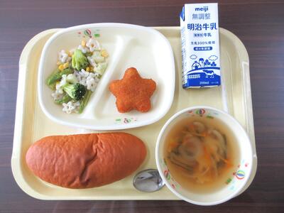 今日の献立は「牛乳パン、牛乳、星型コロッケ、たなばたサラダ、天の川スープ」です。今日は、たなばた献立でした。給食センターの皆さん、子どもたちのために工夫してくださり、ありがとうございます。