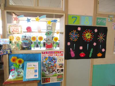 昇降口の近くには、子どもたちが書いた短冊や七夕飾りがあります。